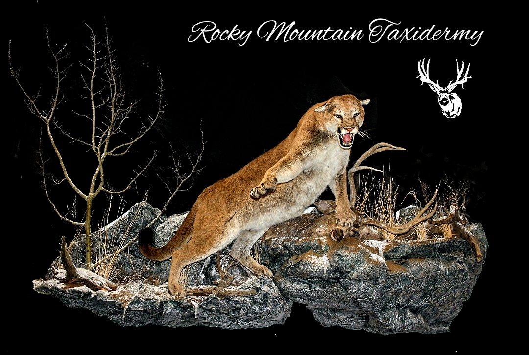 Life-size mountain lion standing over dead deer. 2024 Colorado Taxidermy Championships chamber of commerce best of show, vendors choice most artistic, peoples choice best of show